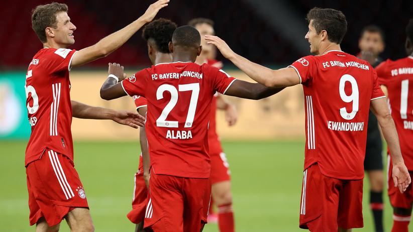 Alphonso davies, robert lewandowski, leon goretzka, javier ''javi'' martinez, serge gnabry mit pokal, mickael ''michael'' cuisance, niklas suele.